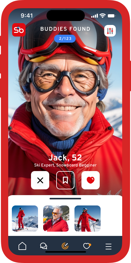 SkiBuddy comes with plenty of choice to set your activity, your level and a few more preferences to ensure best match.